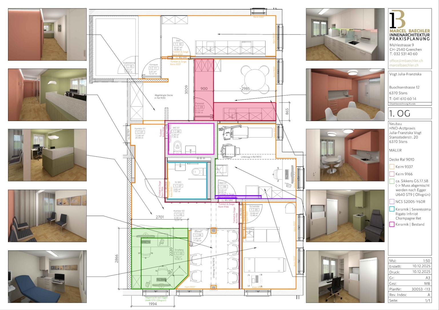 Das Farbkonzept lebt von bewusst gesetzten Kontrasten, die die eher kleinen Räume optisch weiten. Akzentwände in "Ocre Rouge“ bringen Wärme und Energie, während helle Flächen in "Porzellan Weiss“ für Leichtigkeit und Offenheit sorgen. Möbelfronten in tiefem Agavengrün verstärken die ruhige, seriöse Wirkung der Praxis. Ergänzt durch ein speziell entwickeltes Eichenvinyl-Design entsteht ein wohnlicher Charakter, der die funktionalen Anforderungen angenehm einbettet.